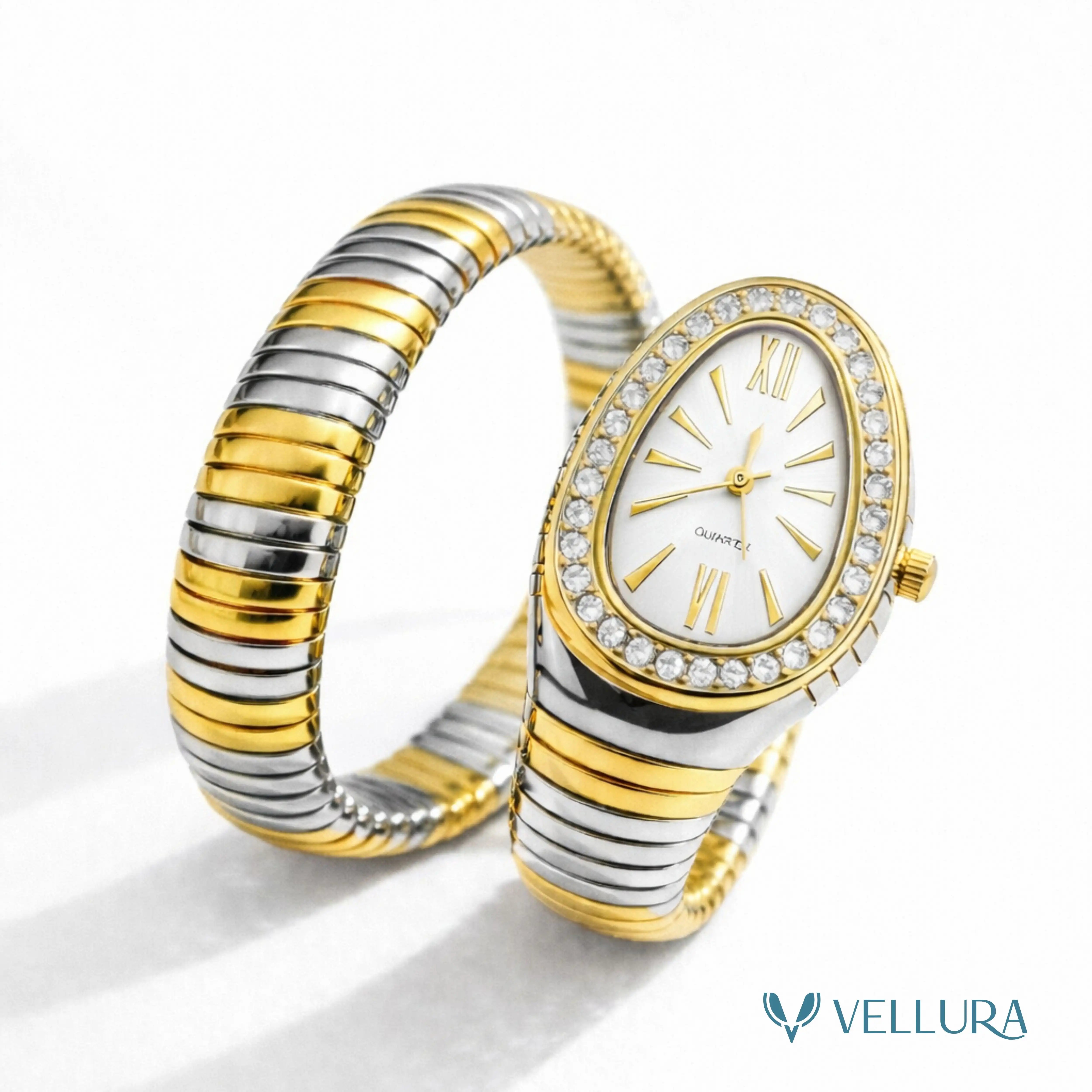 Command attention with timeless elegance in the Vellura Dual-Tone Serpent Wrap Watch, a statement timepiece inspired by iconic high-fashion serpent designs. Featuring a sculptural coiled bracelet silhouette, this watch wraps gracefully around the wrist, creating the look of a luxurious bracelet paired with a refined timepiece.