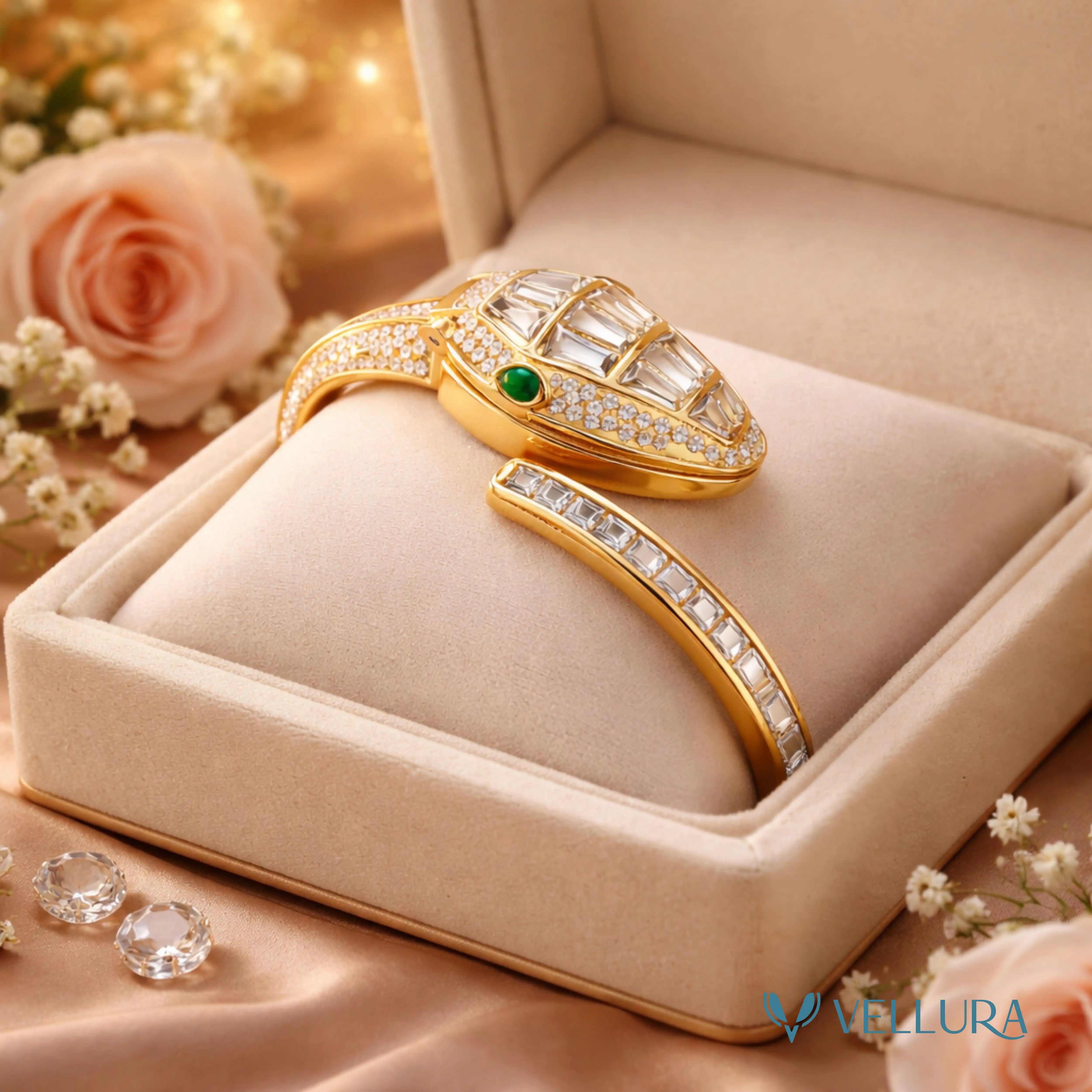 The sculpted snake-head design is embellished with brilliant white baguette-cut stones, creating a clean, luminous look that pairs effortlessly with any outfit. A halo of sparkling crystal detailing outlines the serpent head, while emerald-green stone eyes add a striking contrast and premium finish.