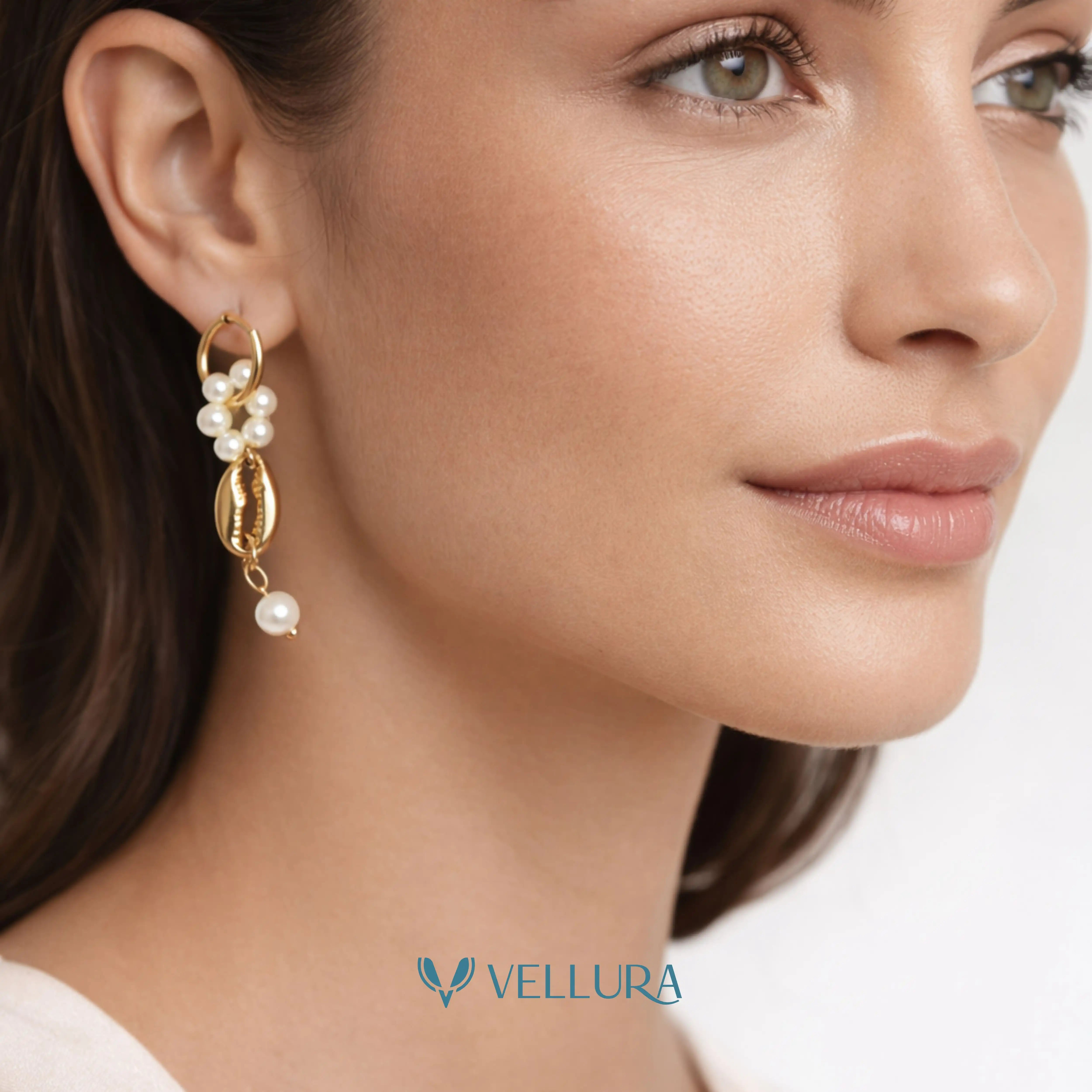 Make a statement inspired by coastal elegance with these Gold Cowrie Shell & Pearl Drop Earrings from Vellura Jewellery. Designed with a refined gold-toned hoop, clustered lustrous pearl beads, and a striking polished cowrie shell charm, these earrings blend beach-inspired charm with modern luxury.