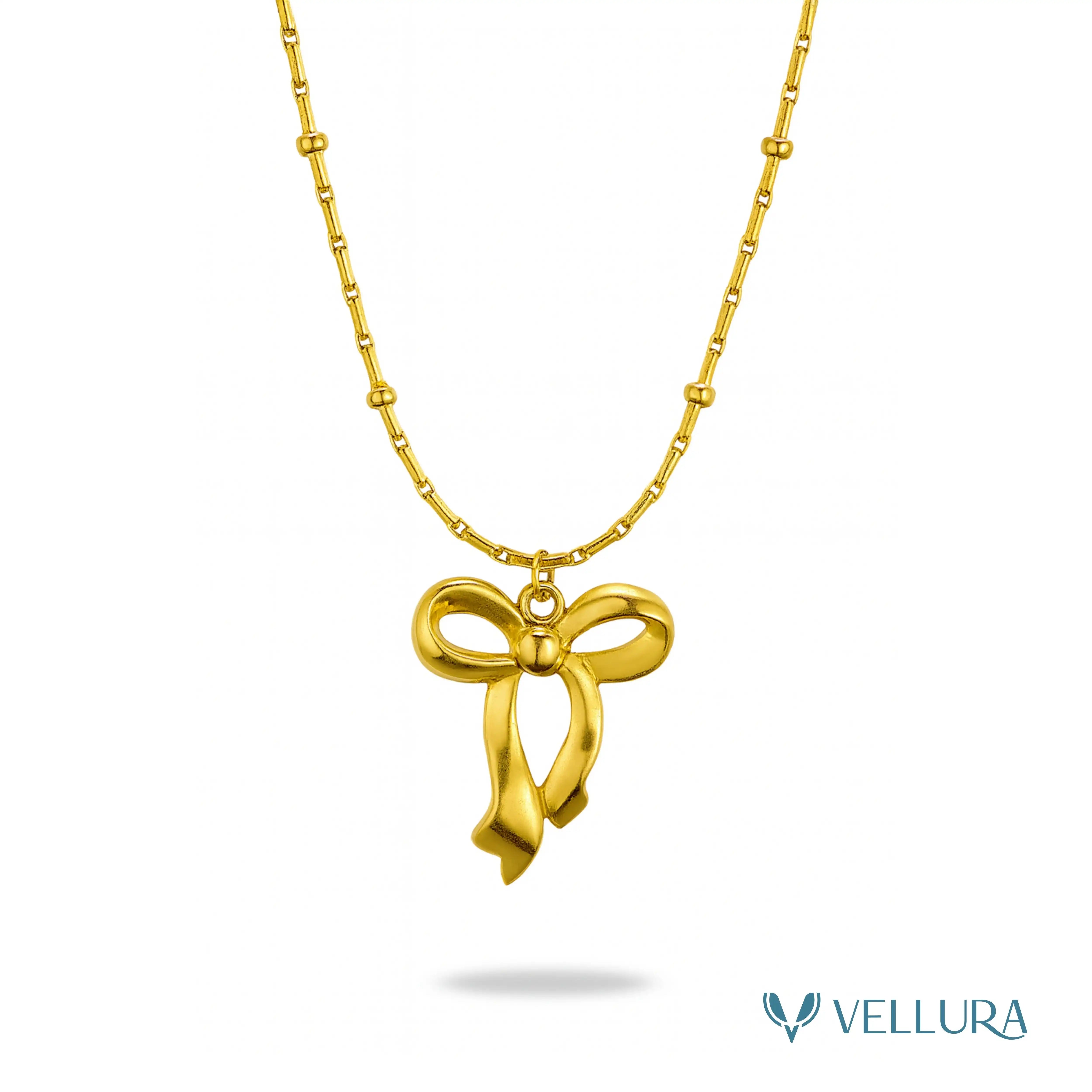 Whether styled solo for a minimal look or layered with other Vellura necklaces, this bow pendant adds a touch of elegance and femininity to any outfit — from casual chic to evening glamour.