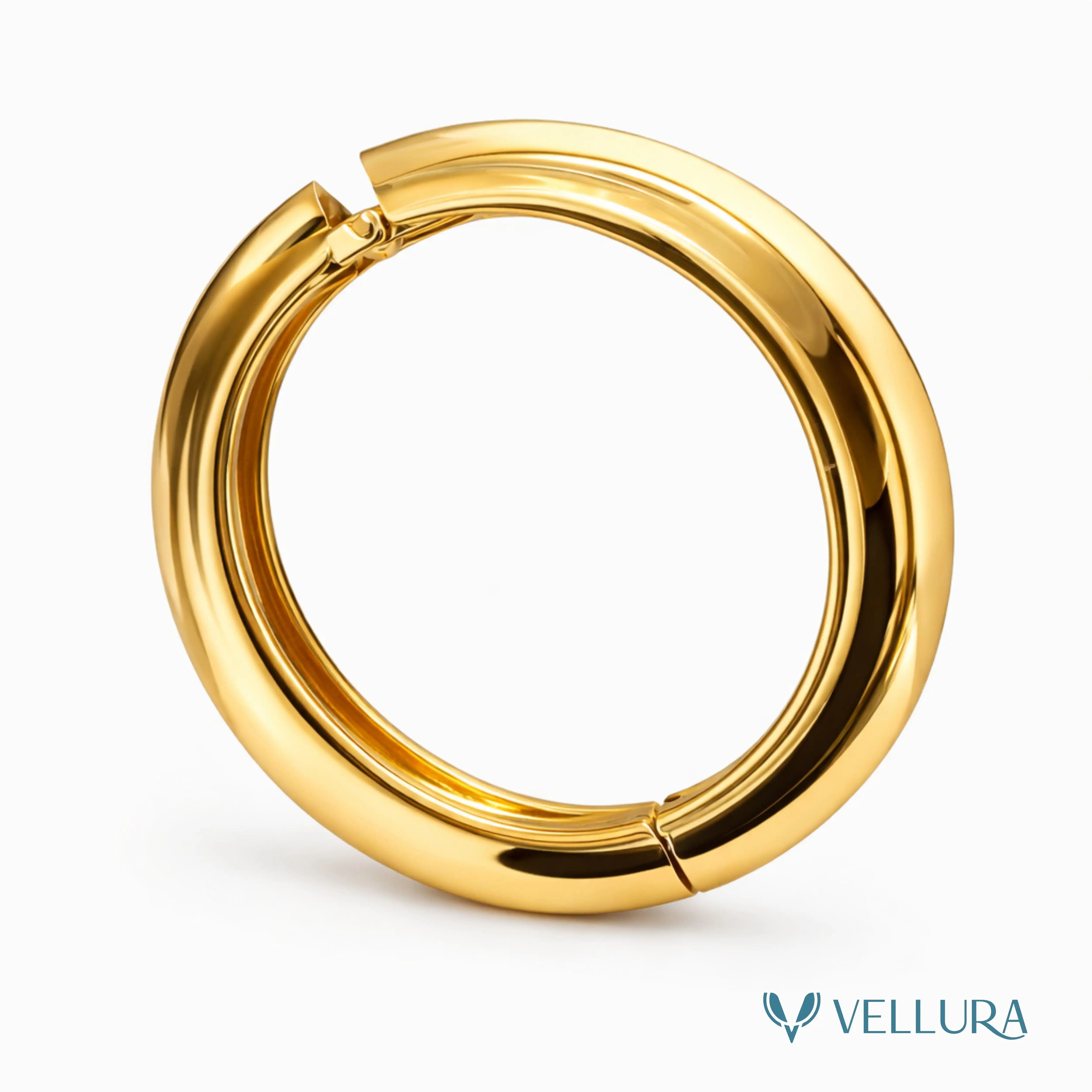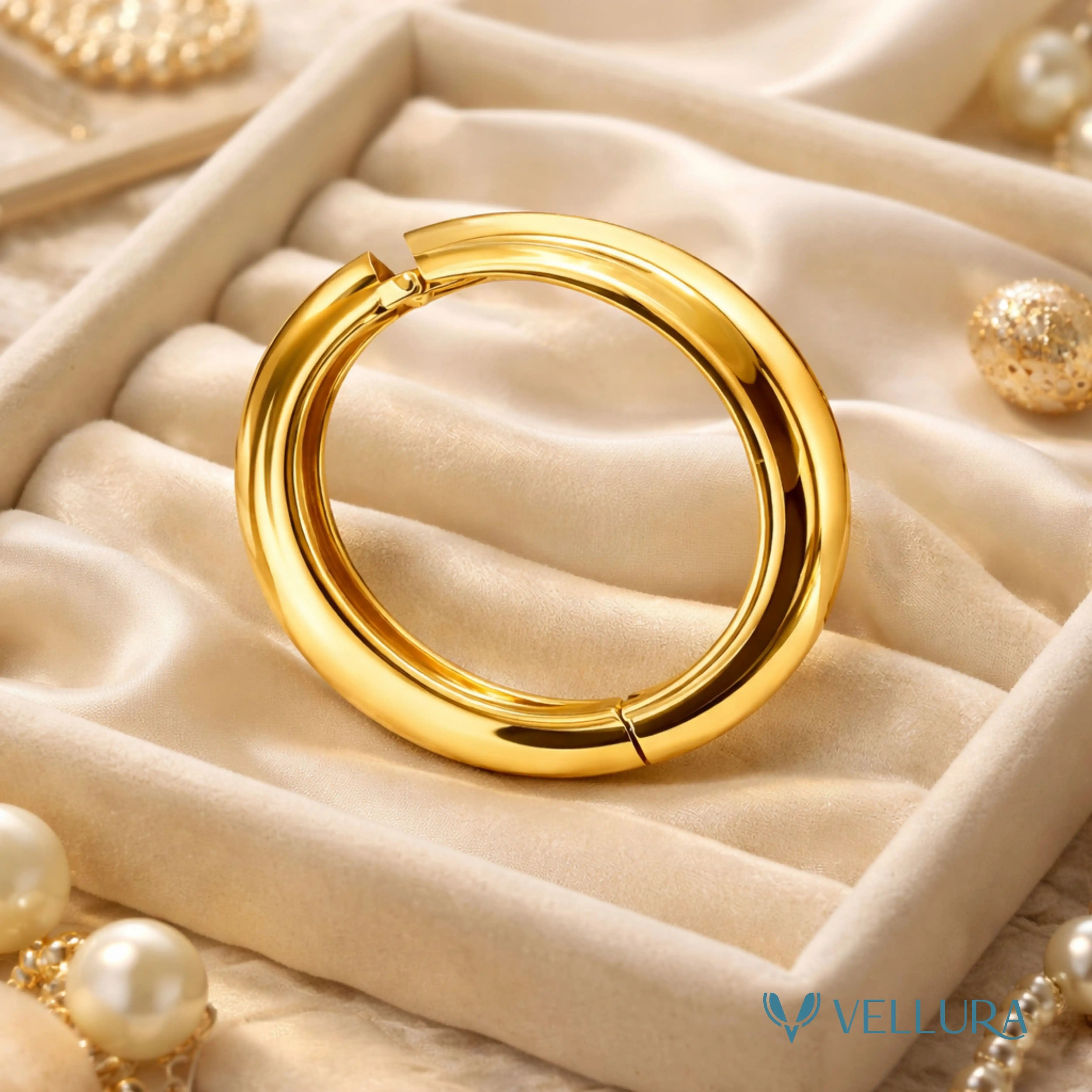 Sleek, bold, and timeless, the Vellura Minimal Gold Hinge Bangle is a modern essential designed for elevated everyday luxury. Crafted with a smooth, high-polish gold-tone finish, this bracelet features a clean circular silhouette and a secure hinged clasp, offering both refined aesthetics and effortless wear.