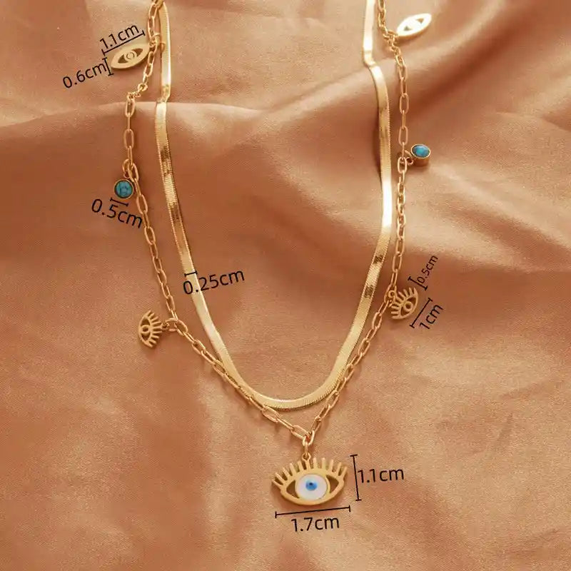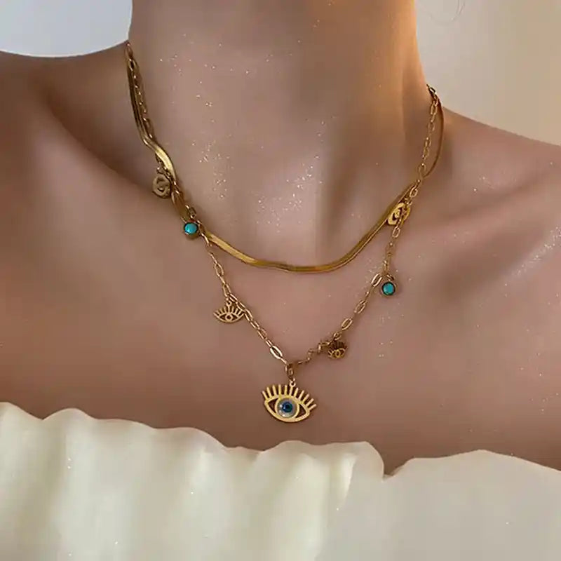 Designed to resist tarnishing, fading, and everyday wear, this necklace is perfect for daily styling or adding a bold statement to your favorite boho outfit. The layered chain includes a flat herringbone chain and a chic link chain adorned with eye motifs and turquoise stone charms, giving it a rich, curated look.