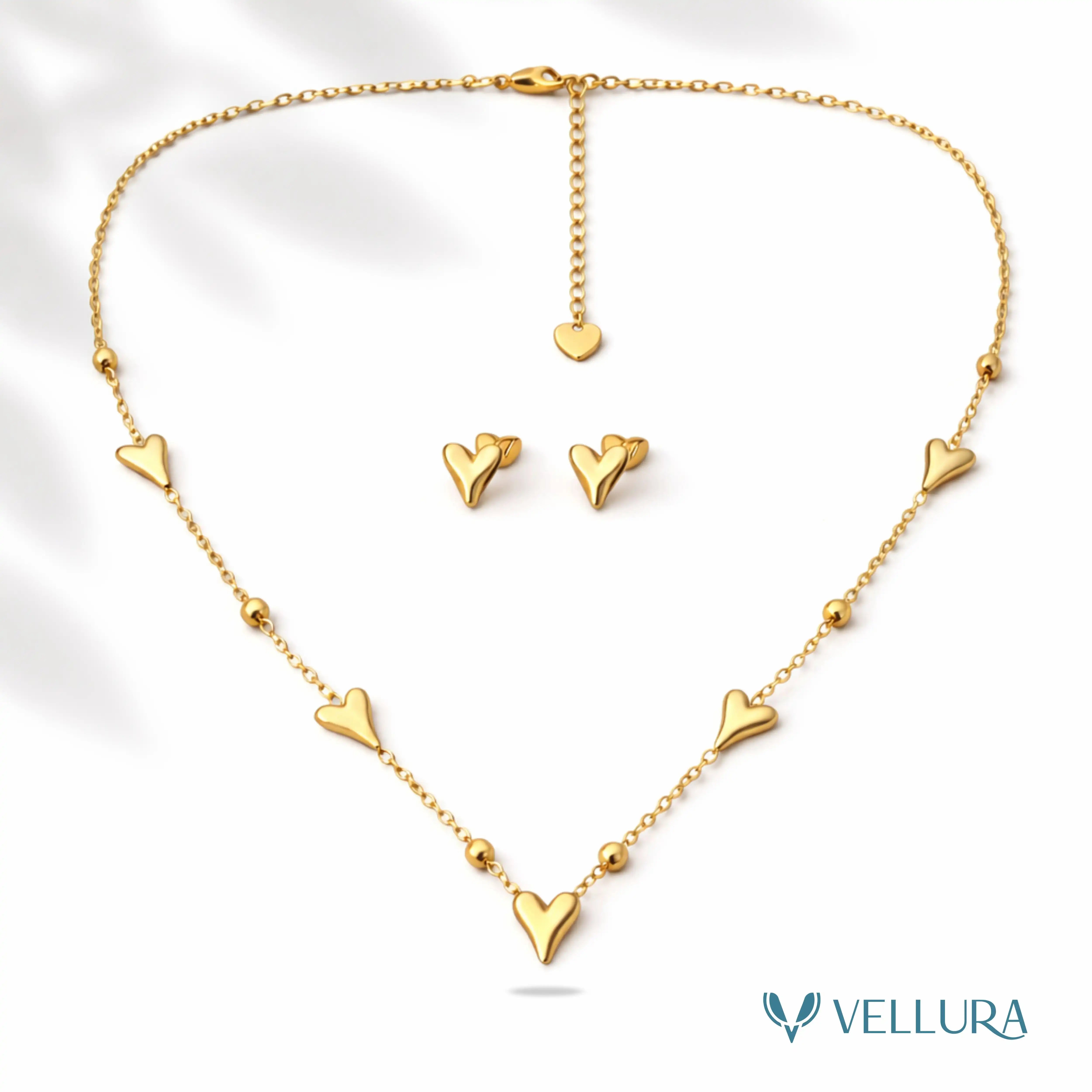 Paired with matching heart-shaped stud earrings, the set delivers a cohesive and refined look—perfect for daily wear, work styling, or special moments. Crafted using premium anti-tarnish materials, the jewellery retains its luminous gold shine while offering durability and lightweight comfort.