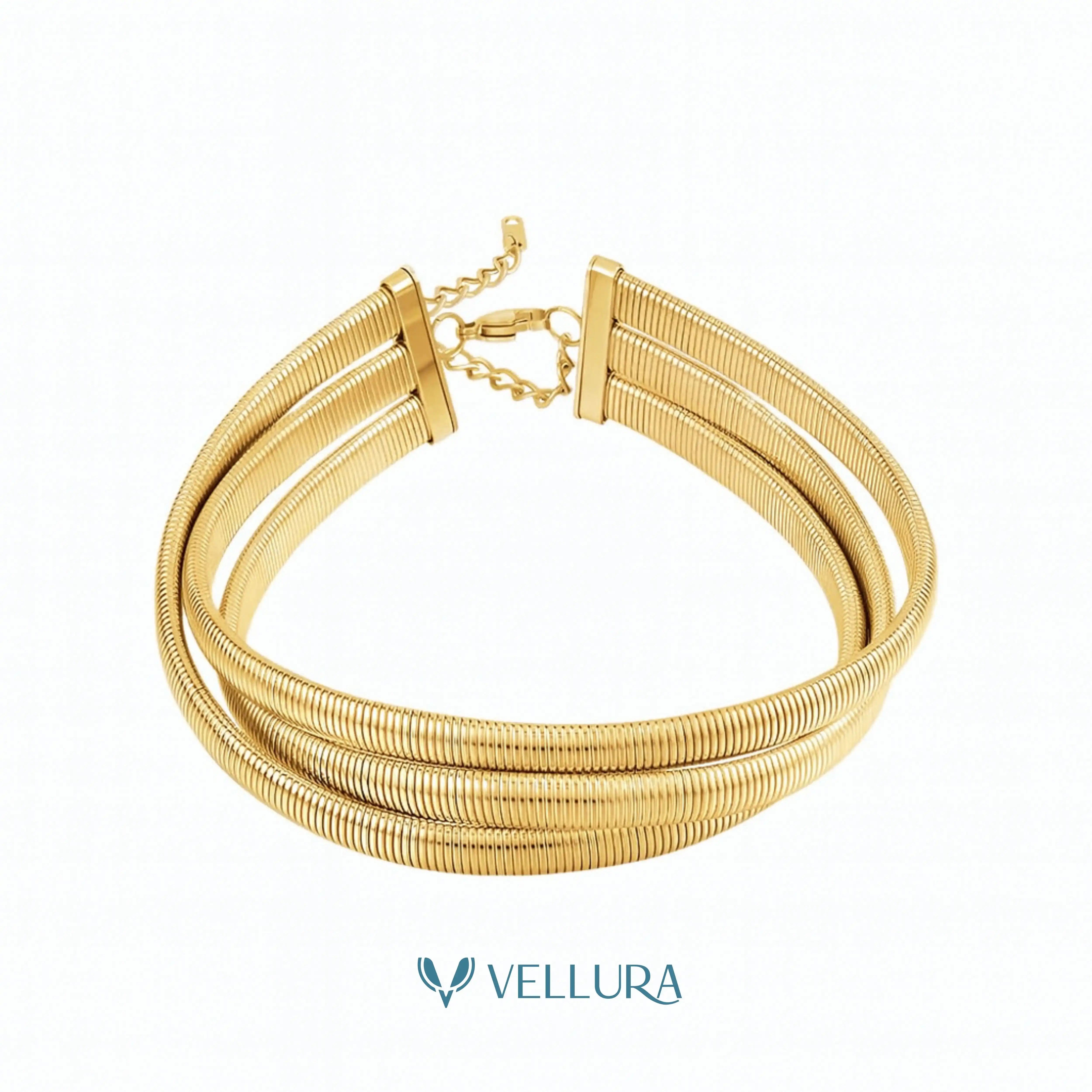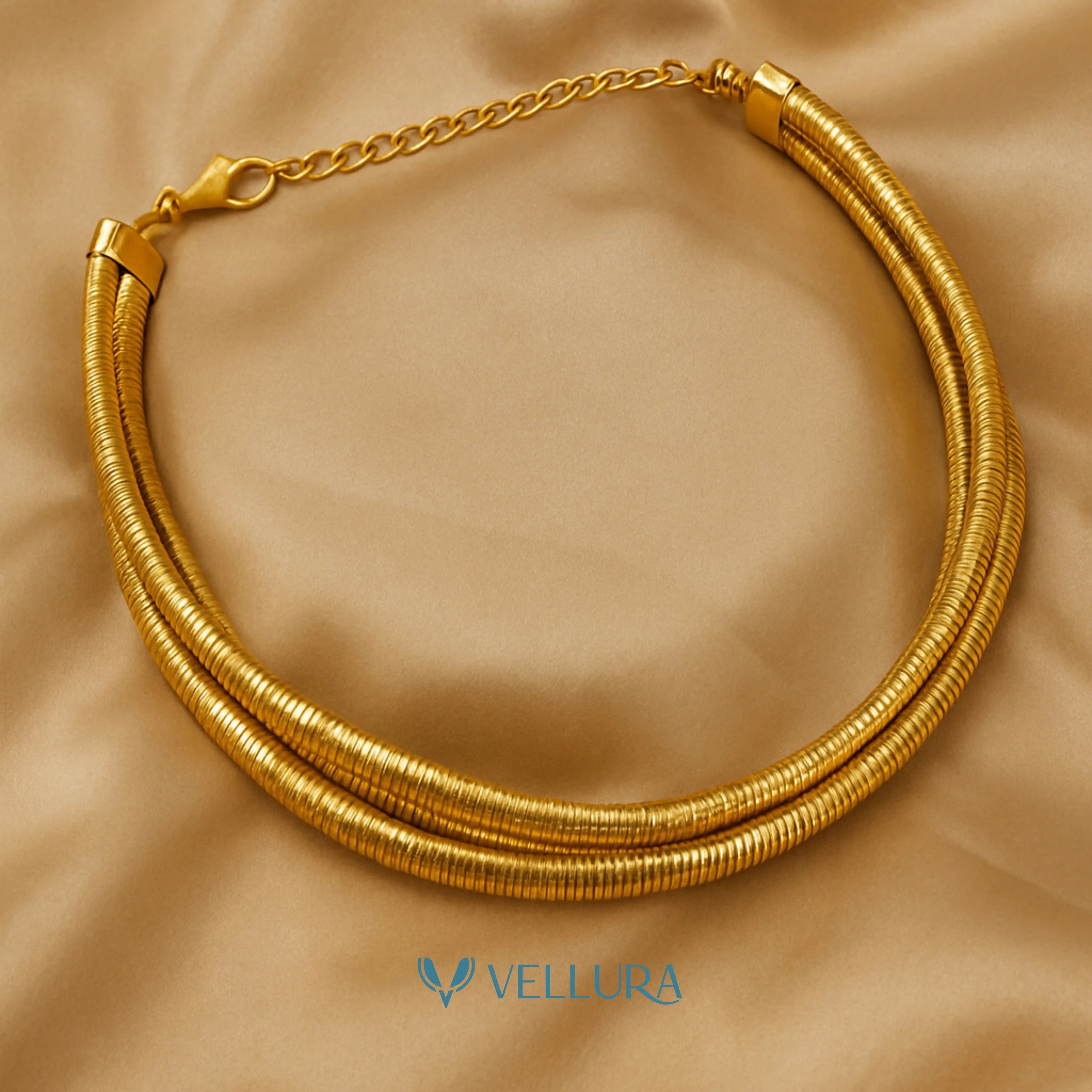 Bold, contemporary, and effortlessly elegant, the Vellura Multi-Strand Gold Choker Necklace is designed to make a powerful style statement. Featuring multiple finely ribbed gold-tone strands, this choker creates a rich layered effect that sits beautifully around the neckline, exuding modern luxury and confidence.