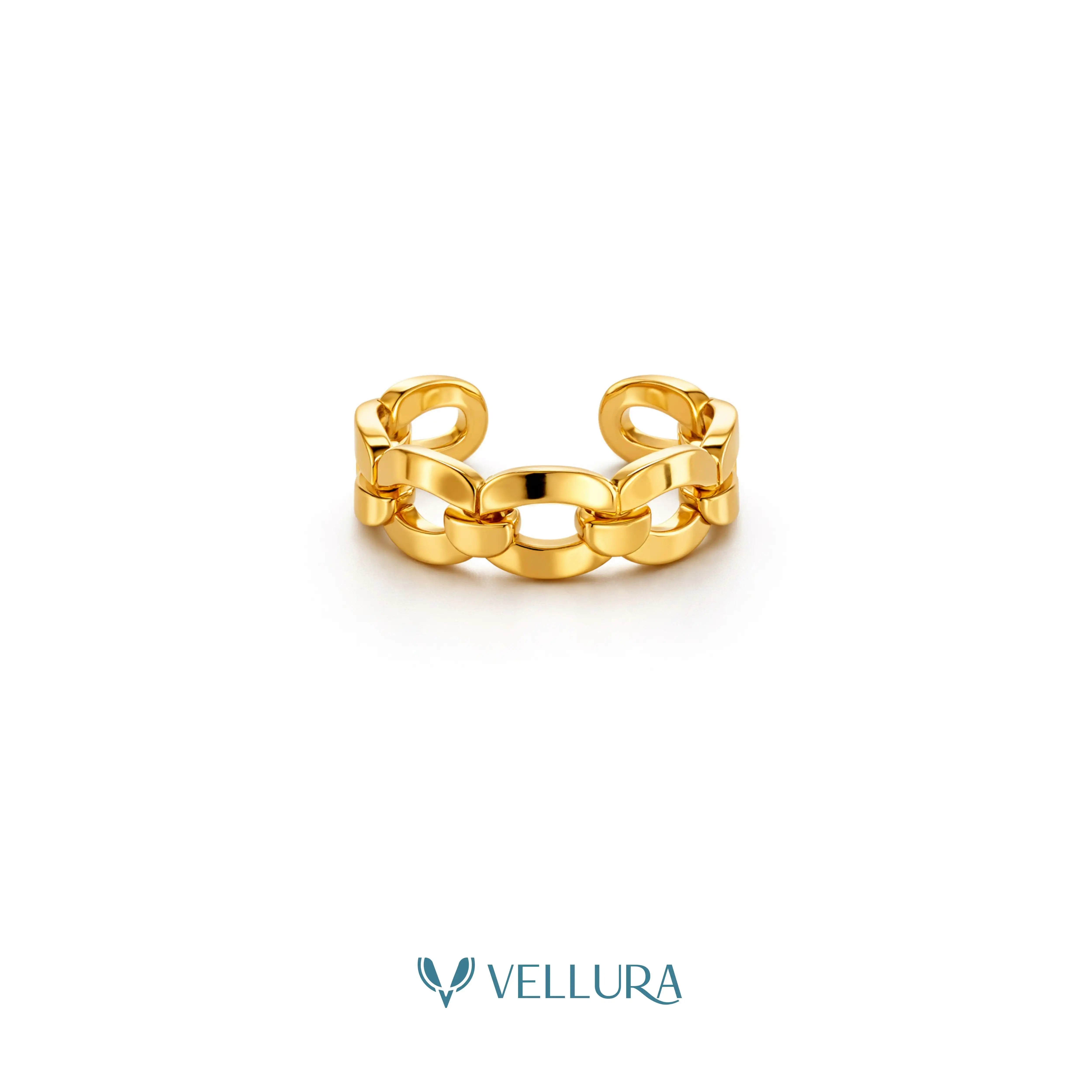 Crafted with a high-polish gold finish, each link reflects light beautifully, creating a rich, mirror-like shine that enhances both casual and elevated outfits. The open adjustable design ensures a comfortable, flexible fit while maintaining the ring’s structured and sculptural appearance.