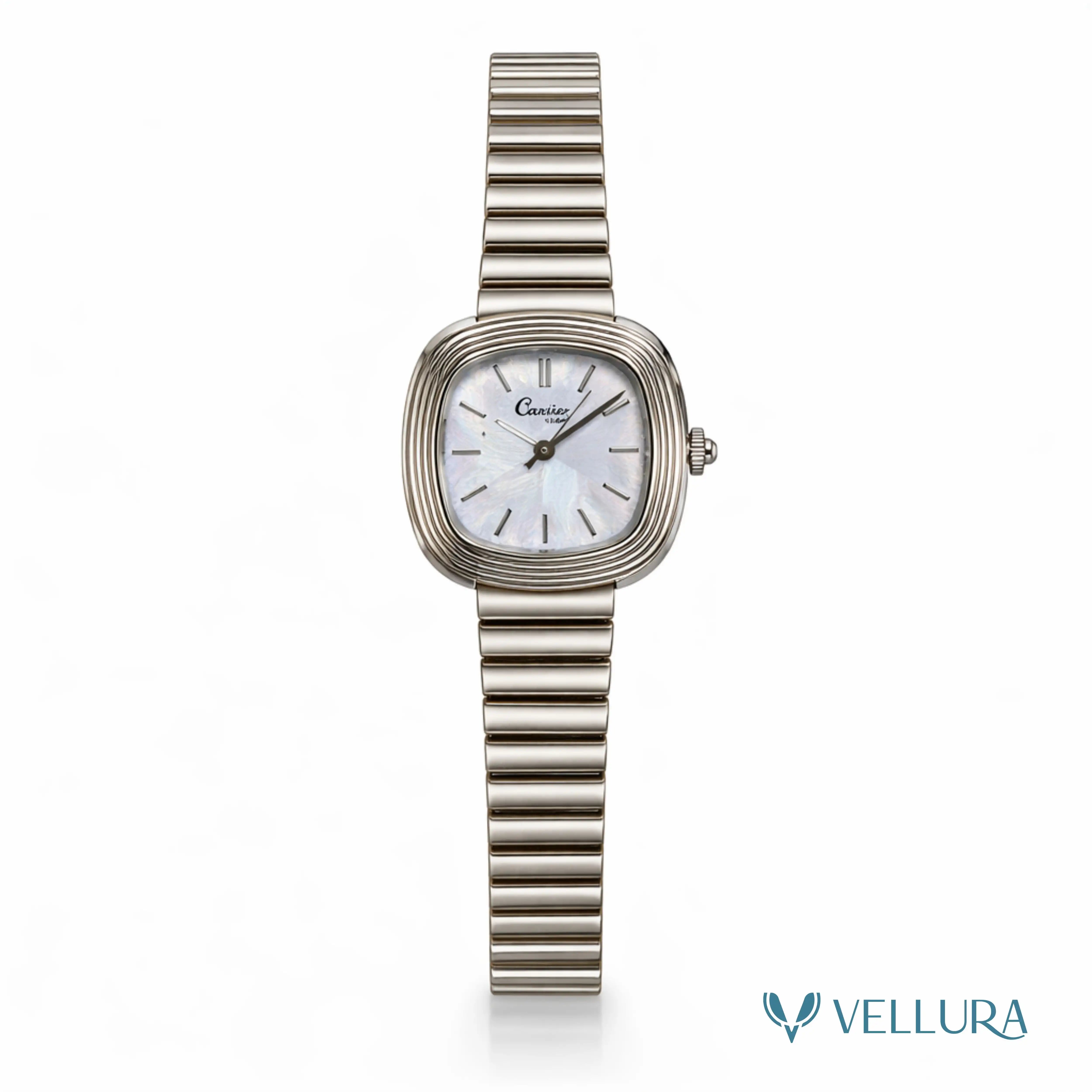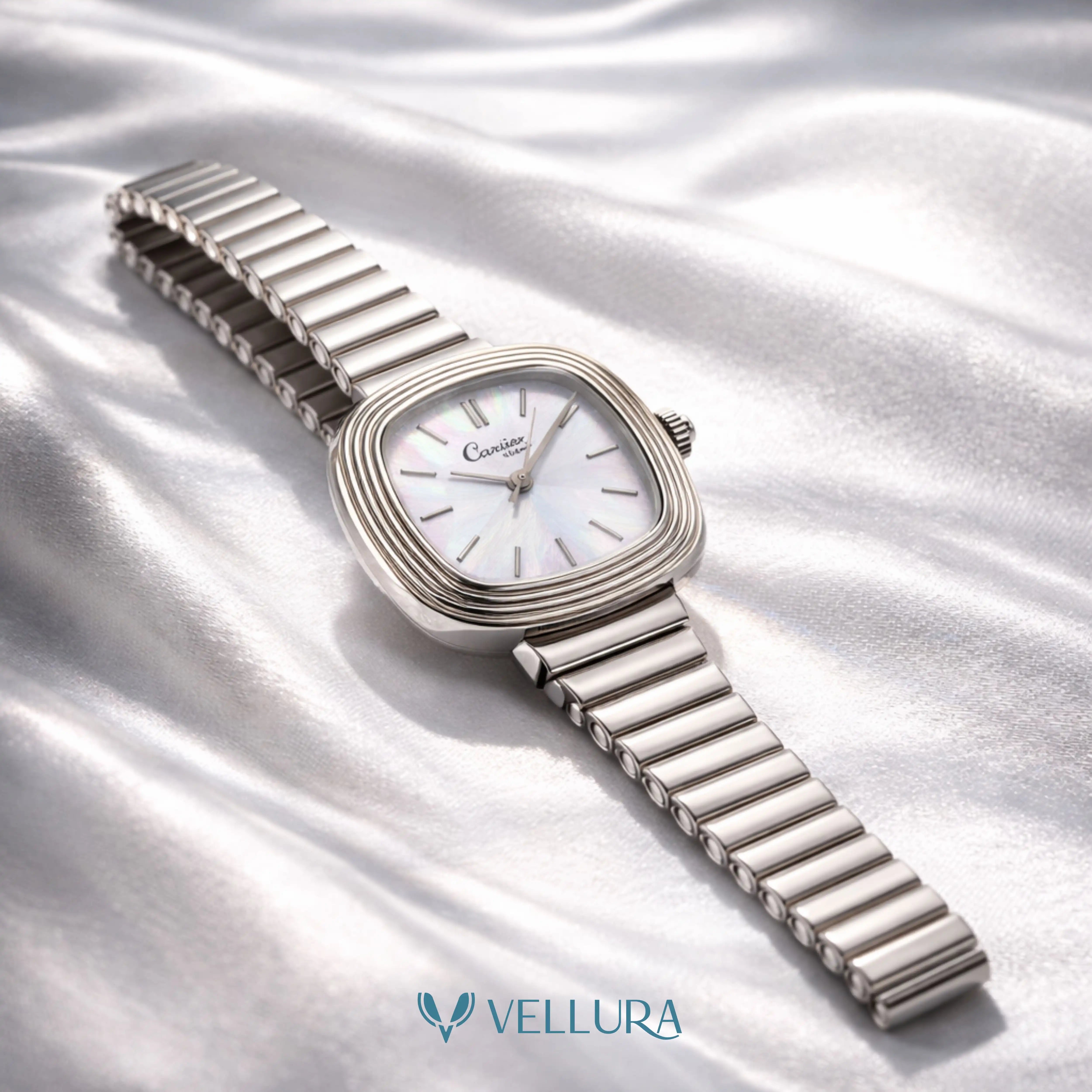 Graceful, minimal, and effortlessly sophisticated — this Silver Mother of Pearl Dial Watch by Vellura Jewellery is inspired by timeless luxury watch designs. Crafted for women who appreciate subtle elegance, this timepiece blends refined detailing with modern simplicity.