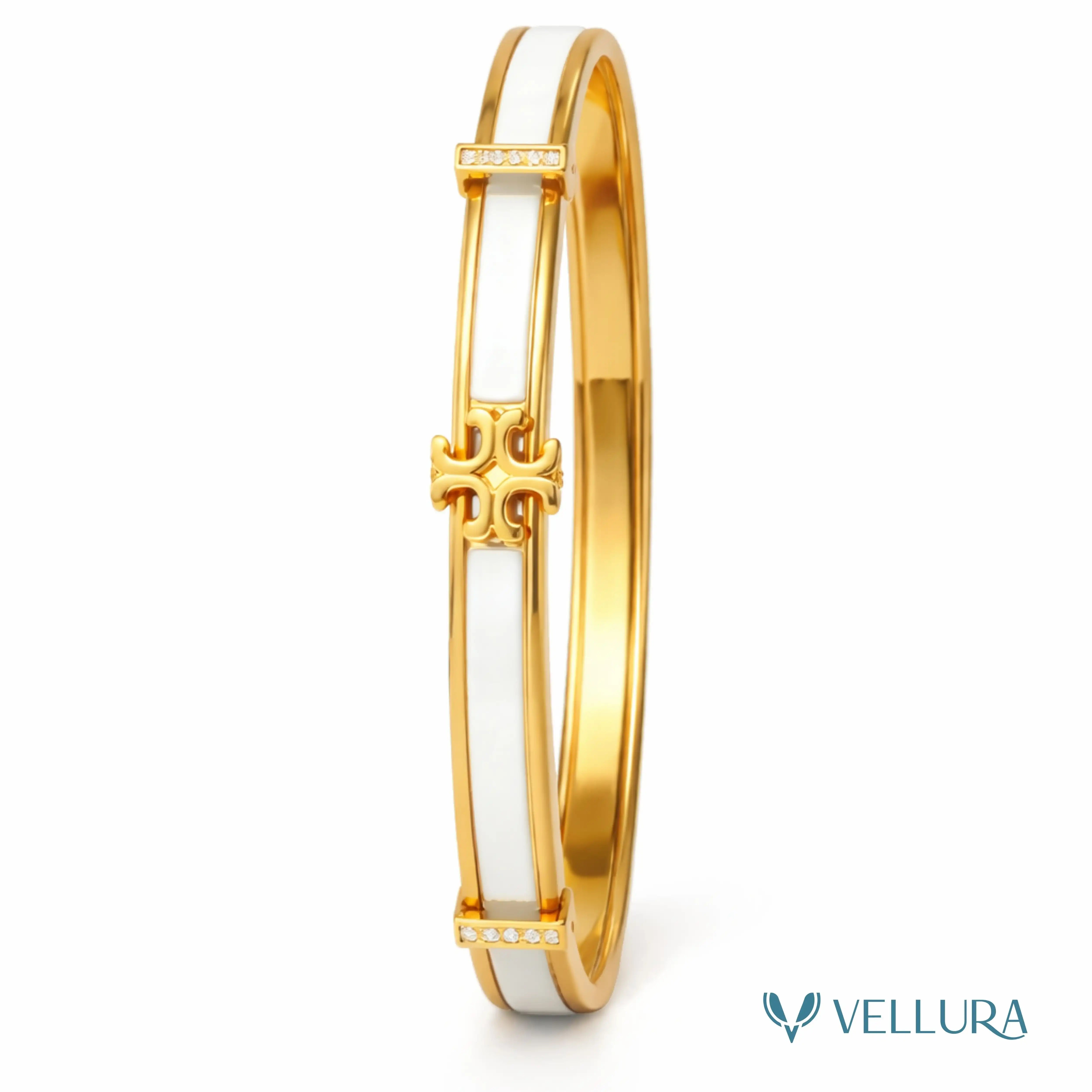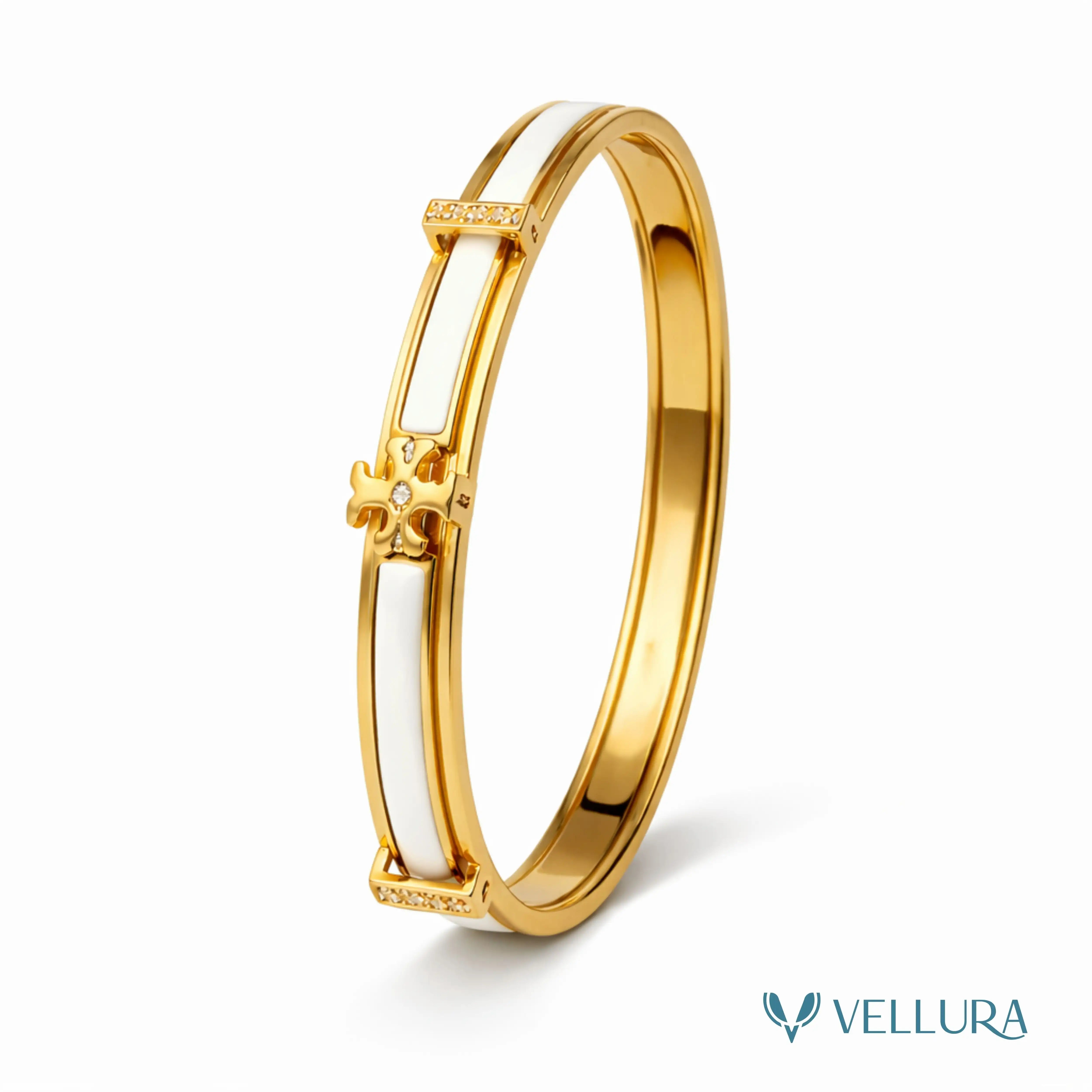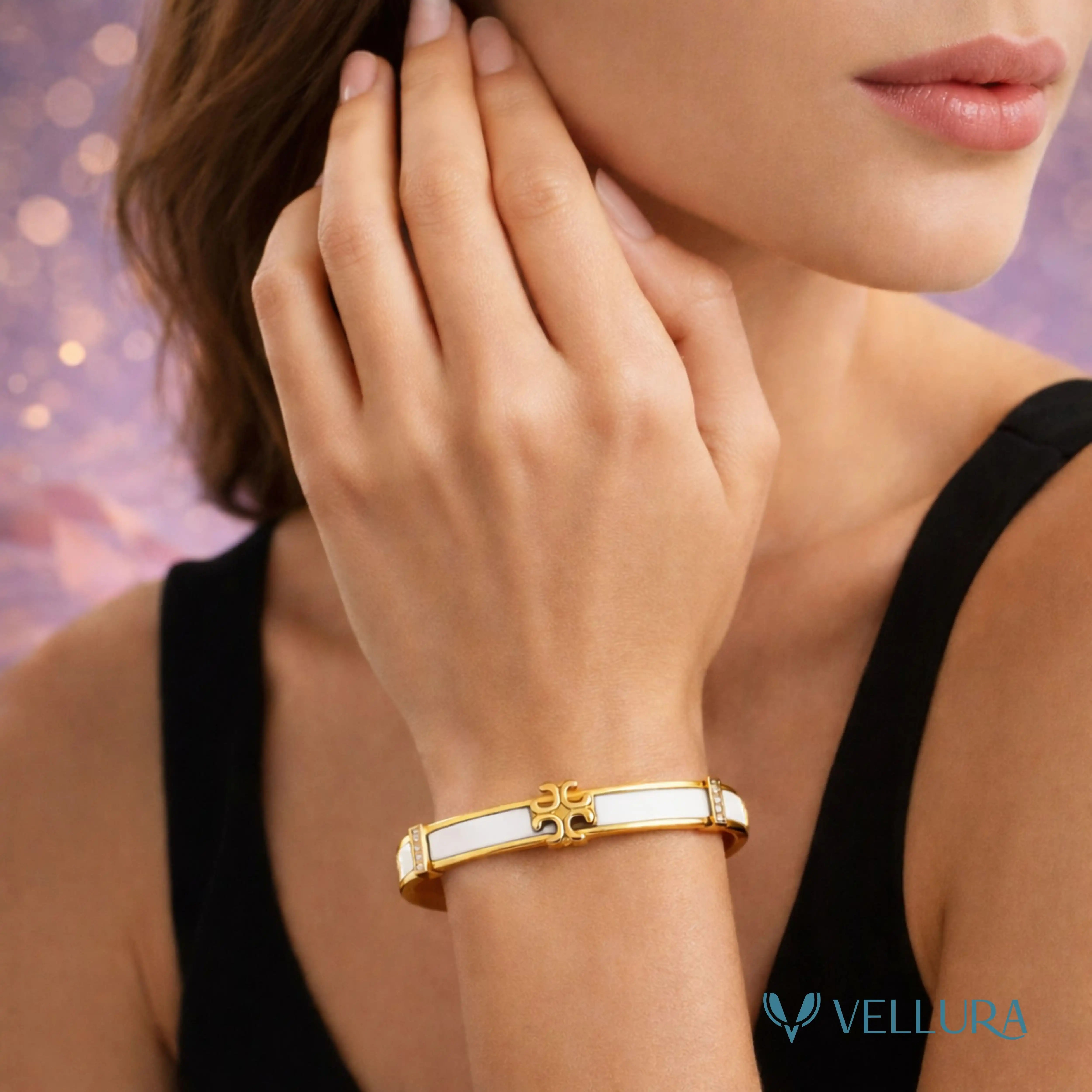 Elevate your everyday elegance with the Vellura Gold Black white Bracelet, a refined statement piece designed for women who love modern luxury with timeless appeal. Featuring a sleek black white inlay set within a polished gold-plated bangle, this bracelet blends bold contrast with graceful sophistication.