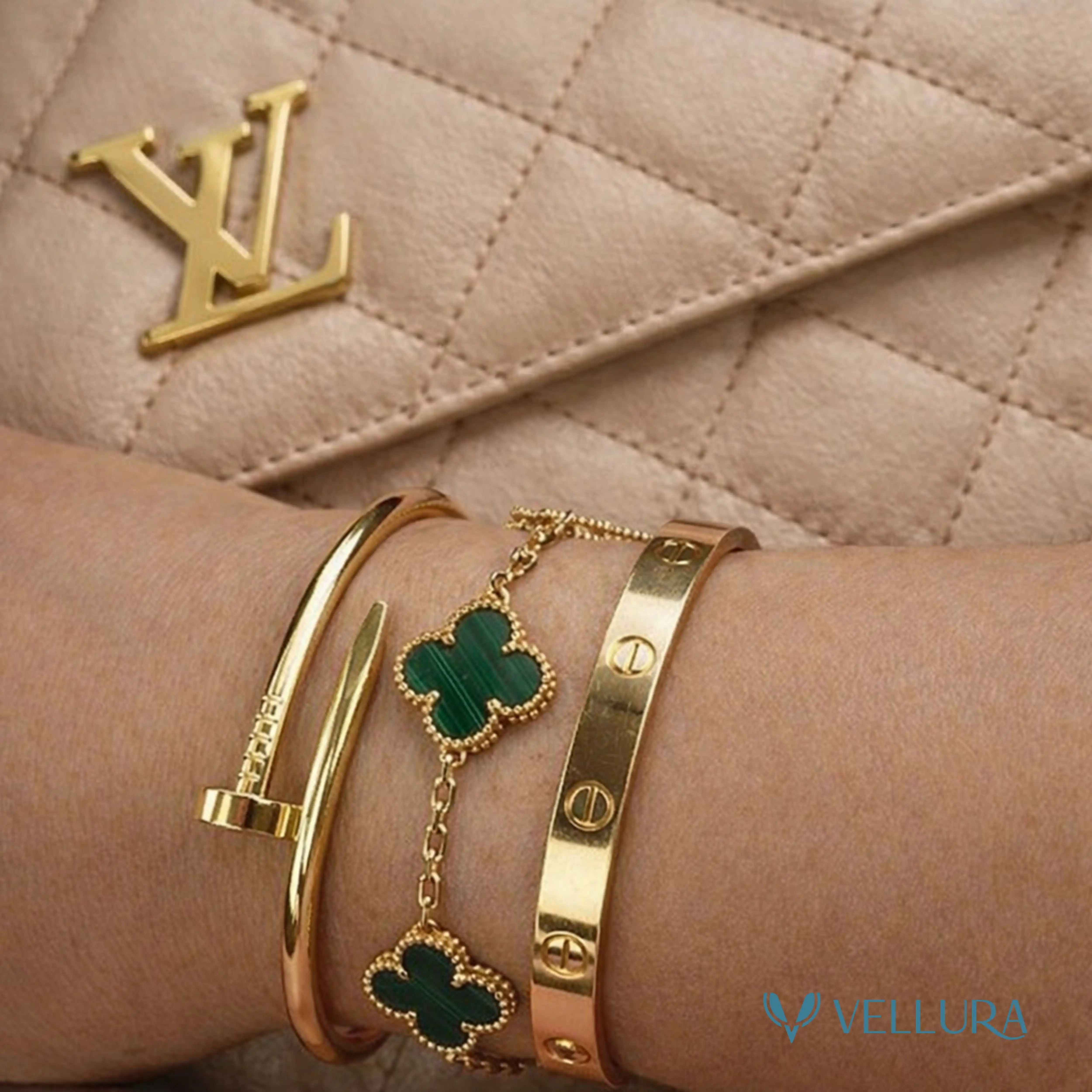 Upgrade your everyday style with this Vellura Jewellery Gold Bracelet Combo Set, a thoughtfully curated trio that blends modern design with timeless elegance. This versatile set includes three distinct bracelet styles—a sleek studded gold bangle, an iconic nail-inspired bracelet, and a delicate black clover motif chain bracelet—perfectly balanced for statement layering or individual wear.
