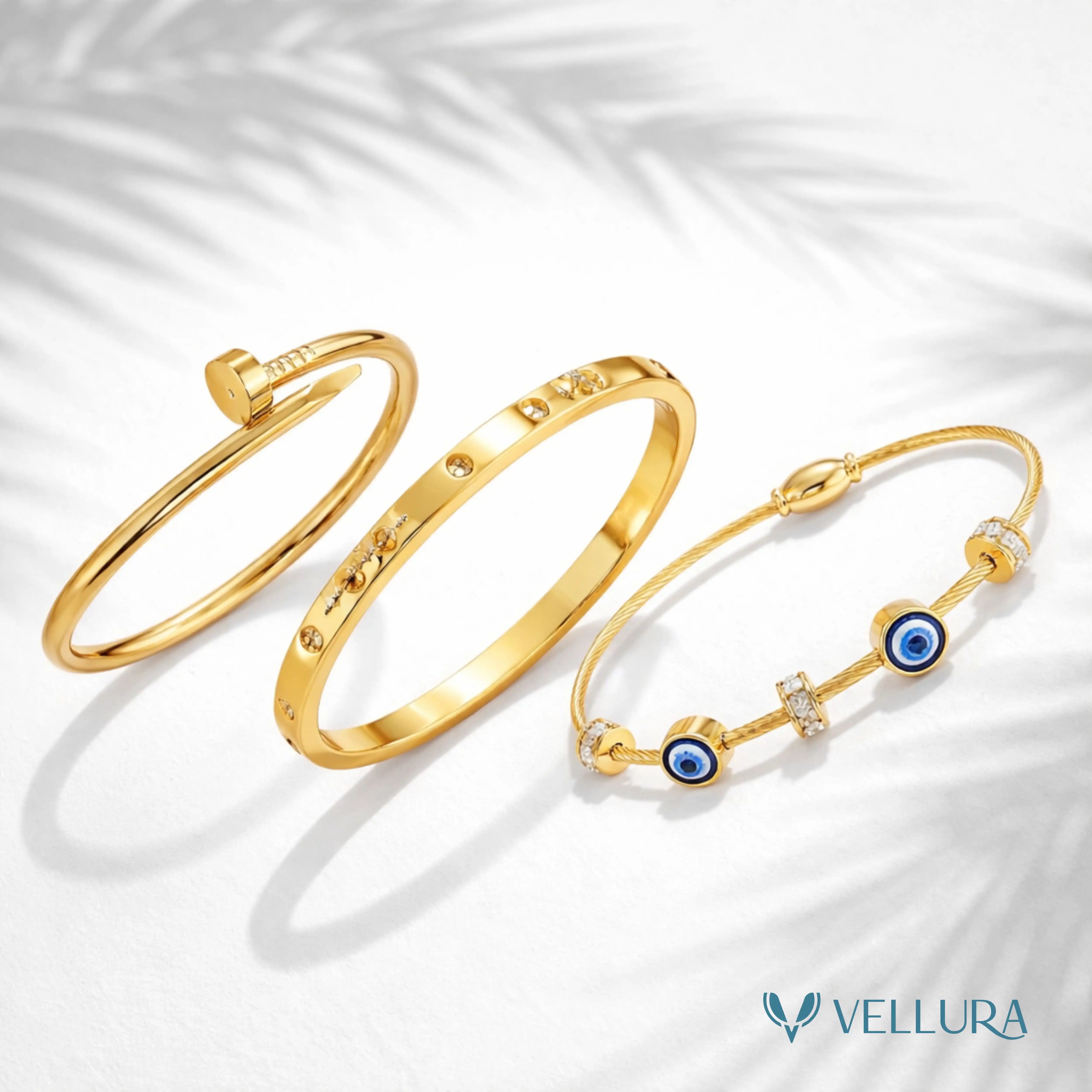 Perfect for gifting, festive styling, or everyday luxury, the Vellura Bracelet Combo reflects refined craftsmanship, durability, and contemporary elegance — a must-have addition to any jewellery wardrobe.