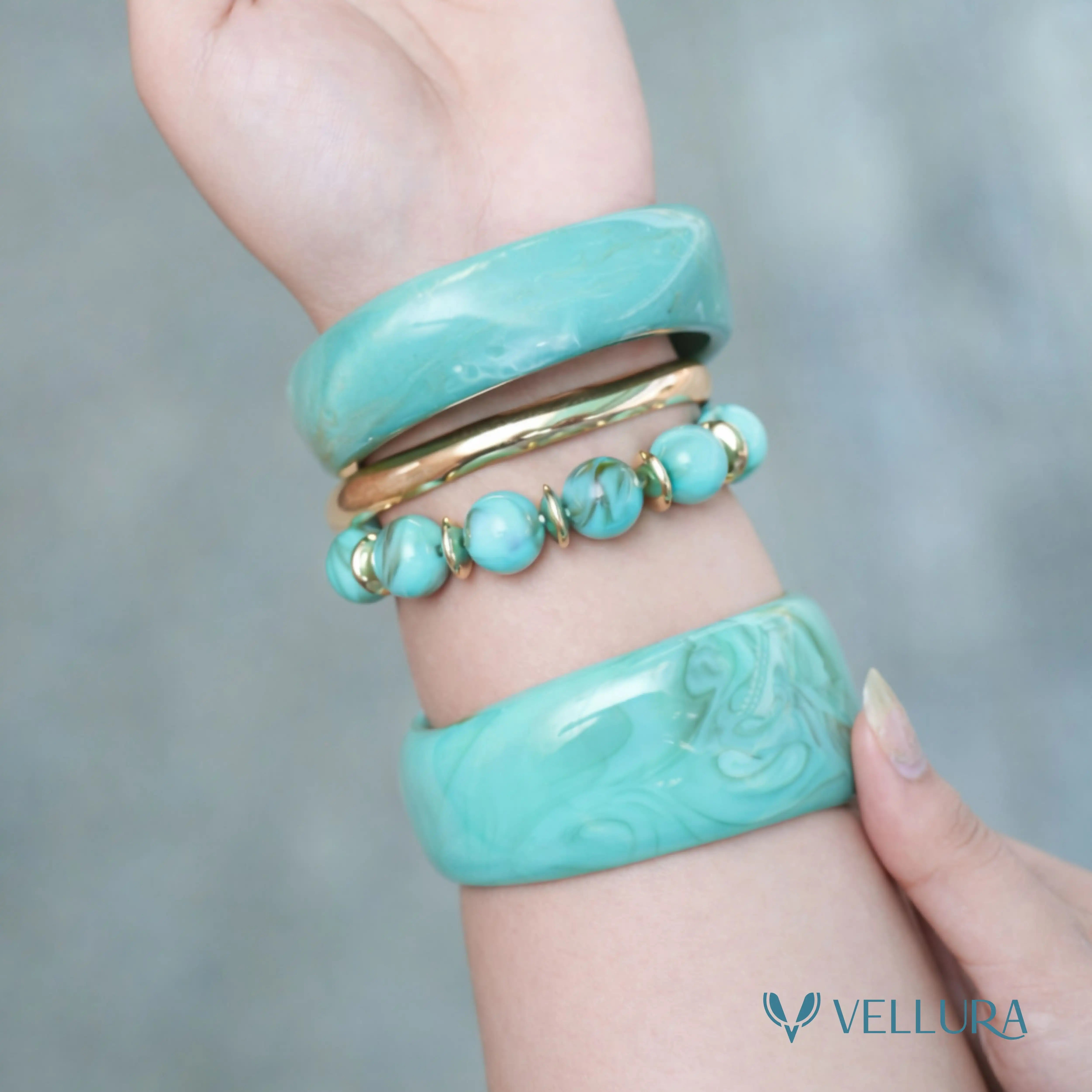 Refresh your jewellery collection with the soft elegance of the Vellura Jewellery Mint Green Marble Resin Bangle Set. Designed for women who love subtle colour with a luxurious finish, this statement bangle set features a soothing mint green marble resin texture, paired beautifully with a sleek gold-tone accent bangle and matching beaded detailing for a refined, contemporary look.Crafted from premium lightweight resin, these bangles offer a smooth, skin-friendly fit that’s comfortable for all-day wear. The high-gloss marble effect enhances the delicate swirls and depth of the mint hue, making every piece unique and visually striking.Perfect for summer styling, brunch dates, office wear, festive occasions, and casual outings, this versatile mint resin bangle set pairs effortlessly with sarees, kurtis, pastel outfits, dresses, and Indo-western looks. Wear them stacked for a bold statement or individually for a minimal, elegant touch.