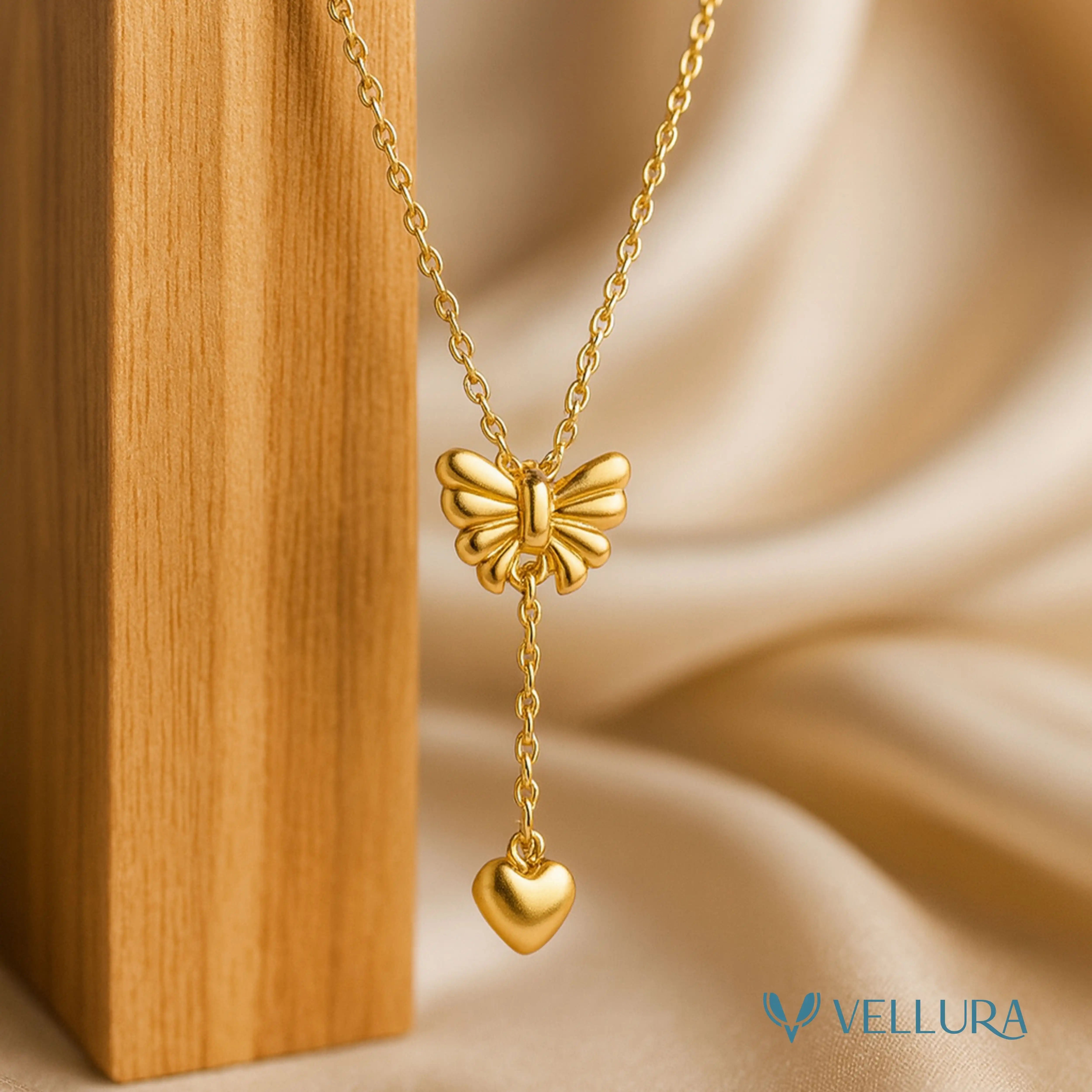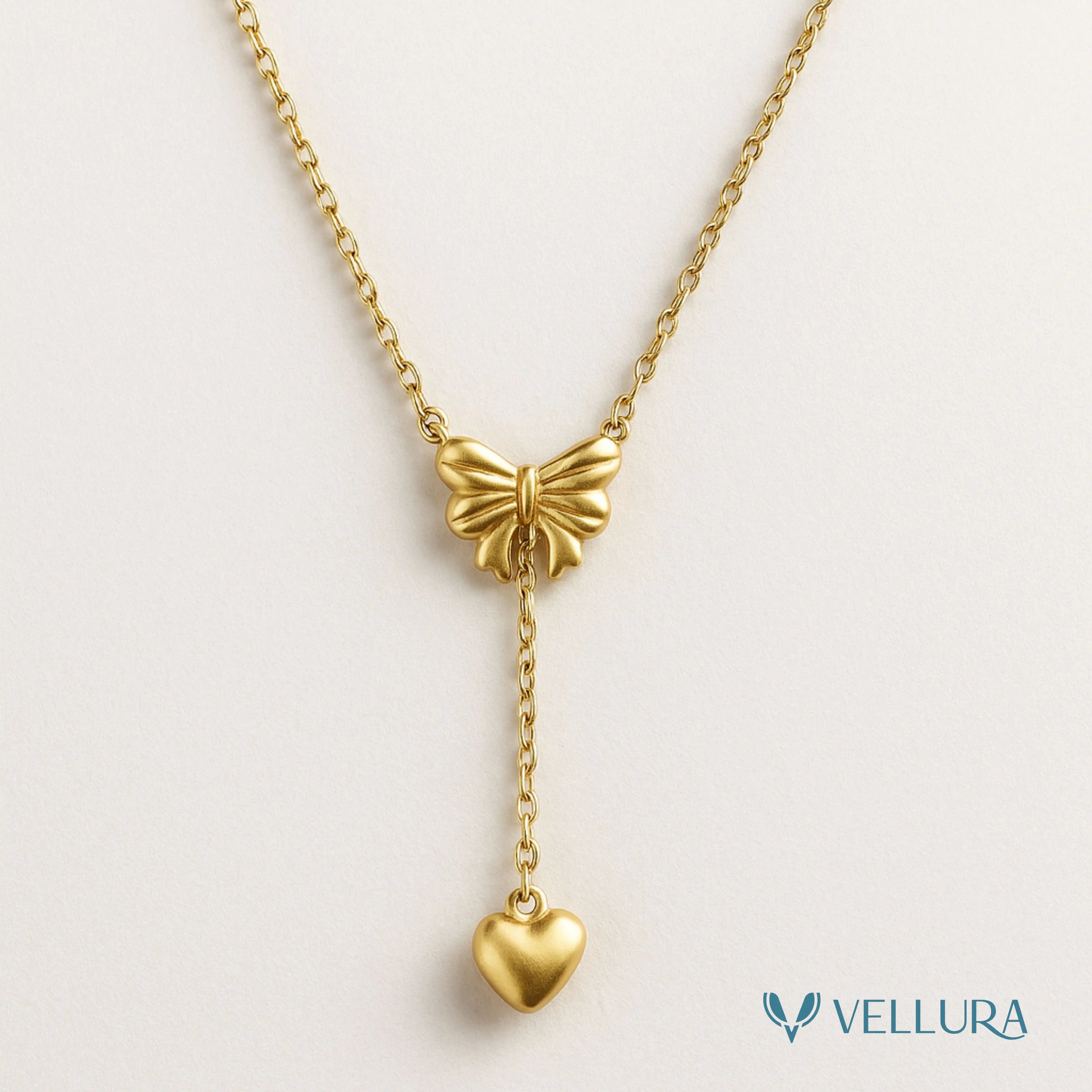 Delicate yet expressive, the Vellura Bow & Heart Drop Gold Pendant Necklace captures romance and elegance in a timeless design. Featuring a beautifully sculpted bow motif at the center, this pendant is enhanced with a graceful dangling heart charm, symbolizing love, femininity, and refined charm.