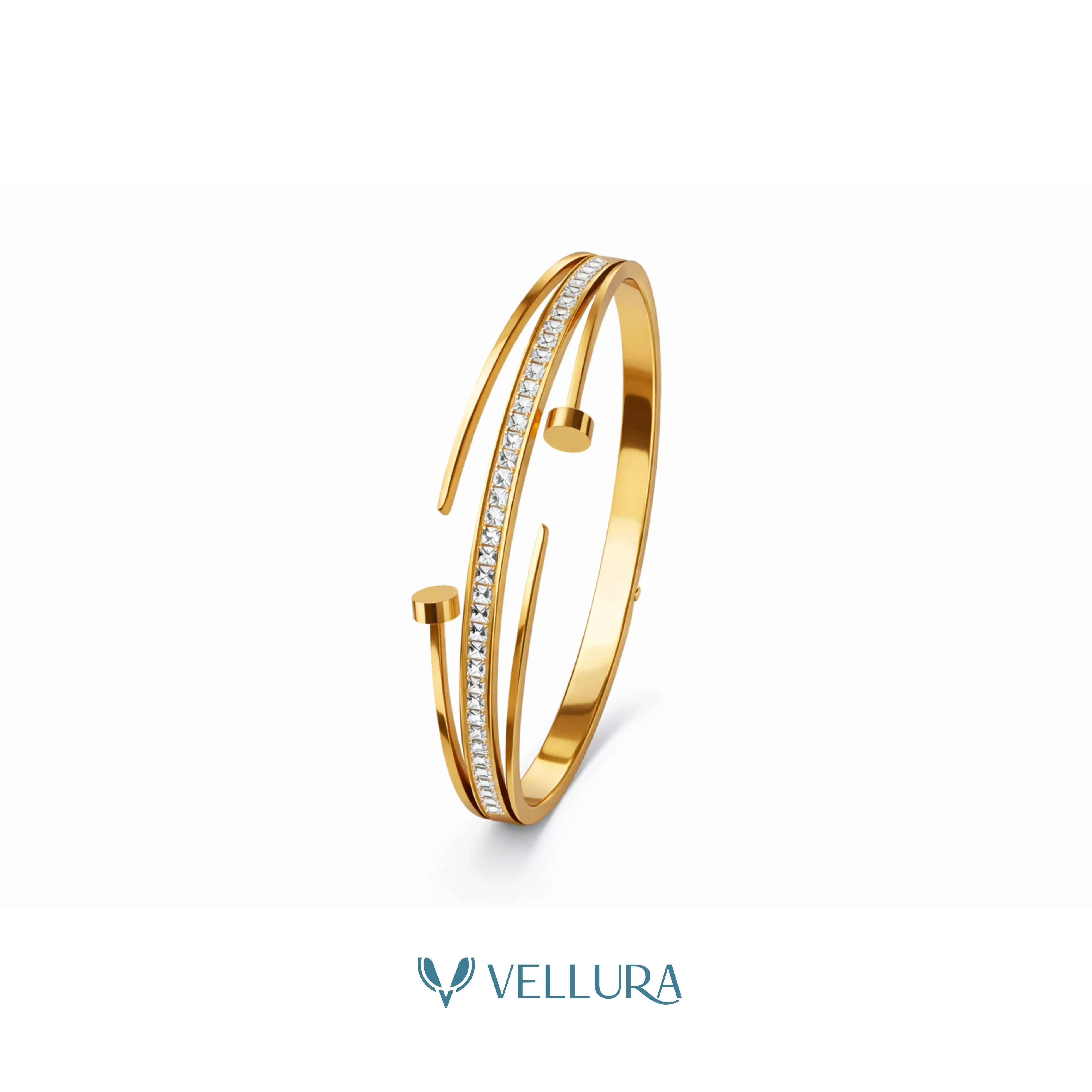 Make a bold yet refined statement with this Cartier-inspired gold nail bracelet by Vellura Jewellery, designed for women who love iconic silhouettes with a modern luxury edge. Crafted in a high-polish gold finish, this sculptural cuff reimagines the classic nail motif, elevated with a sleek line of sparkling crystal stones for added brilliance.
