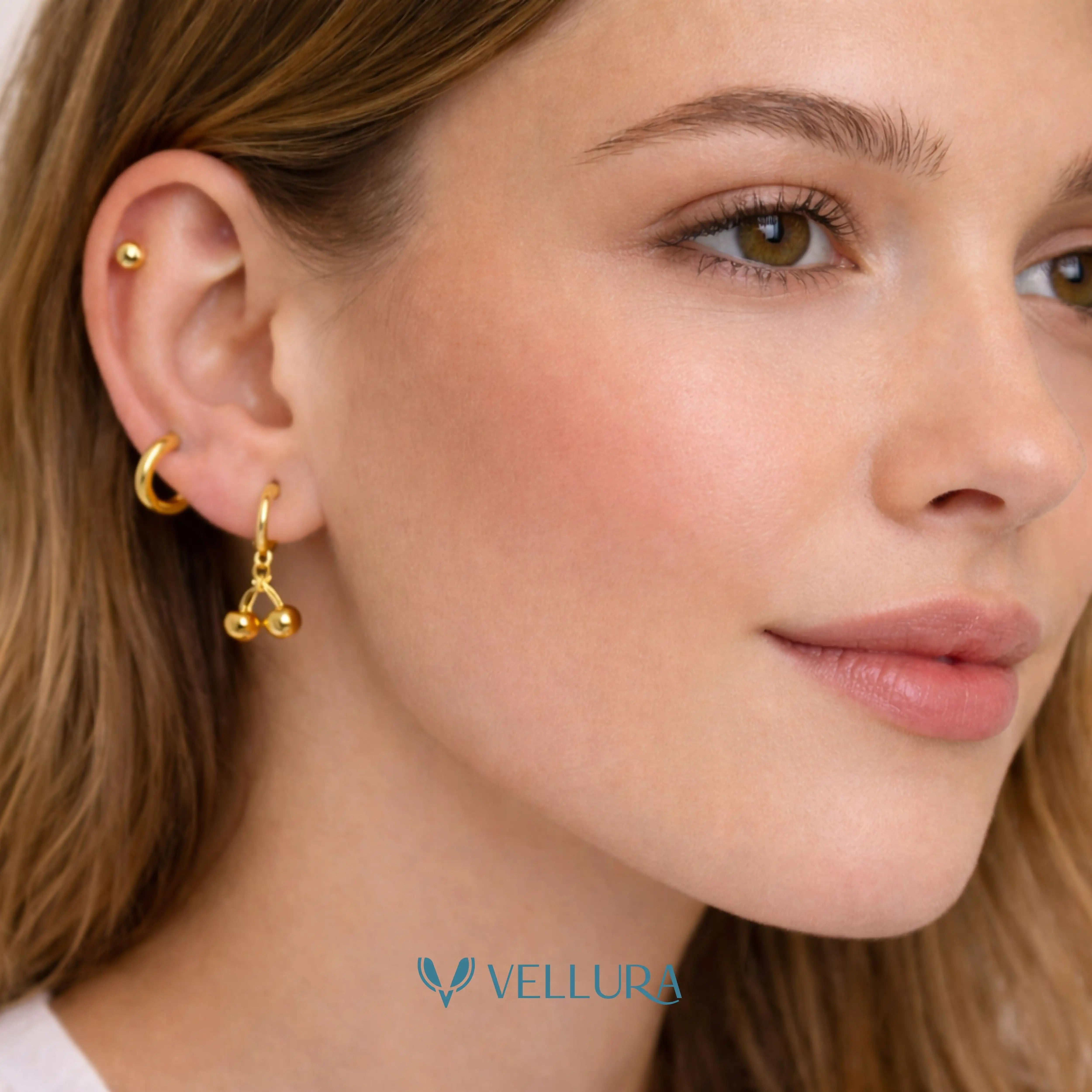 Sweet, playful, and effortlessly chic — the Vellura Gold Cherry Earring Combo Set is designed to add a pop of fun to your everyday style. This curated set includes minimal gold ball stud earrings, classic gold mini hoops with metal cherry charms, and vibrant red cherry enamel charm hoops, offering multiple styling options for ear stacking or standalone wear.